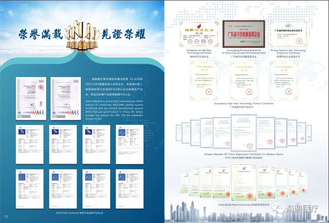 公司通过国际质量体系ISO13485认证,主导产品通过欧盟CE认证,自毁注射器、安全式注射器获得了世界卫生组织(WHO)PQS认证,安全式注射器还通过了美国FDA 510(k)的上市前审查。进过多年的市场推广,产品远销欧洲、美洲、东南亚、中东和非洲等地区。