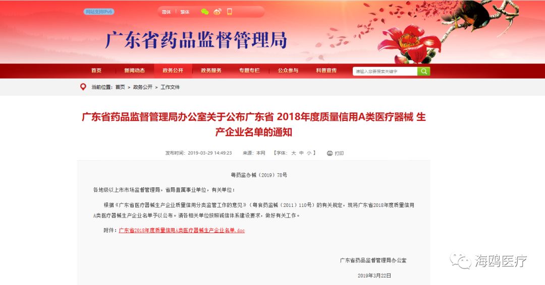 近期,广东药品监督管理局公布了《广东省2018年度质量信用A类医疗器械生产企业名单》。全省有103家医疗器械企业入选,海鸥医疗榜上有名,此次被广东省食品药品监督管理局确定为质量信用A类医疗器械生产企业,也将激励海鸥医疗步步前行,以回报广大用户的支持和厚爱。